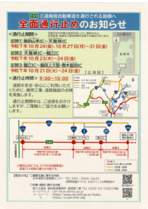 今田人形公演が行われます2025年9月24日ヒガンバナが見頃です2025年9月25日 2025年9月24日 三遠南信自動車道を使って天龍峡にお越しになる方 ご注意くださいませ 天龍峡マルシェ(10/26㈰)の前日と当日は 通行止めが行われませんのでご安心くださいませ そらさんぽ天龍峡にお越しになる場合のナビ設定は 飯田市川路5303-1(天龍峡PA情報発信施設)でお願いいたします ご不便をおかけしますがよろしくお願いいたします osada