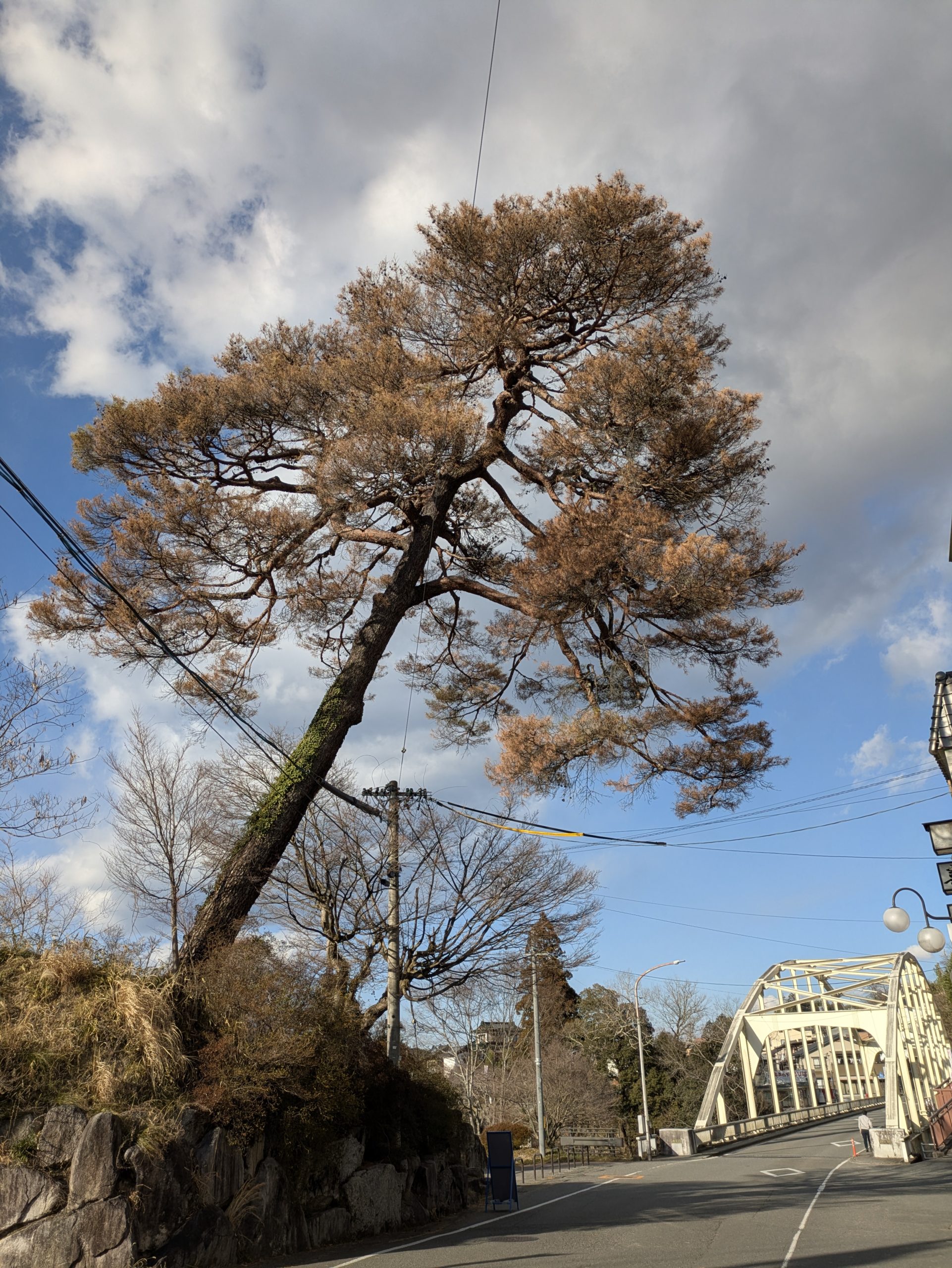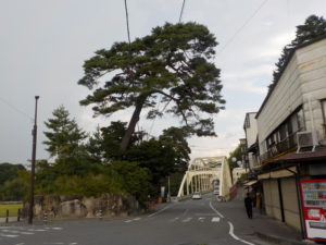 2026年3月10日天龍峡の天竜川脇にある姑射橋広場の松、長い年月にわたって親しまれてきましたがその歴史に幕をおろしました