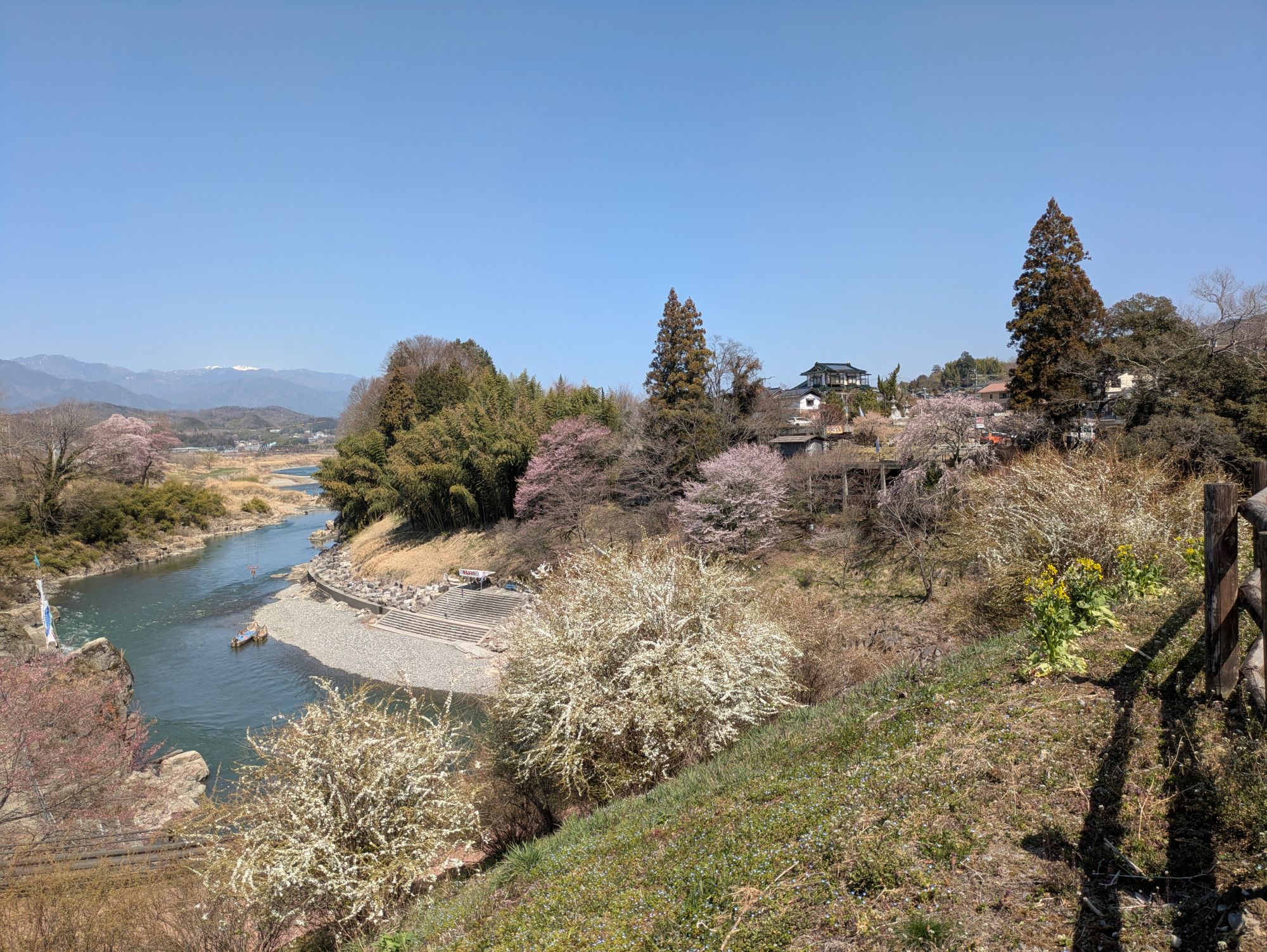 姑射橋広場から対岸の天竜ライン下りの舟が見えます